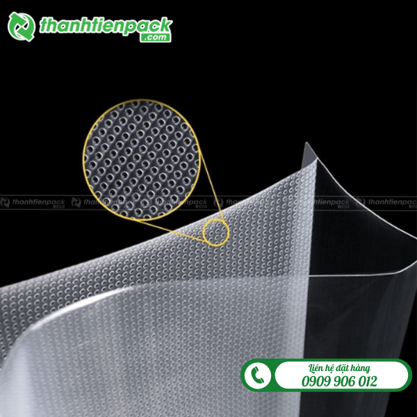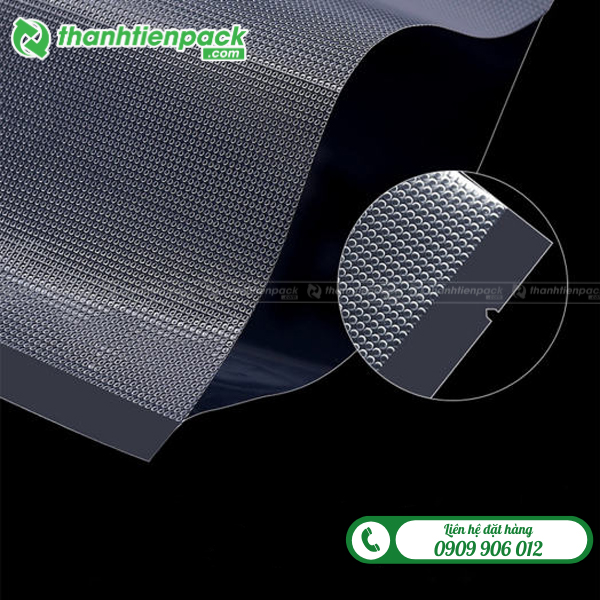 Các họa tiết nhám (chấm bi, gân) trên túi nhám hút chân không tạo kênh dẫn khí, giúp máy hút chân không loại bỏ không khí triệt để, đảm bảo túi kín hoàn toàn.